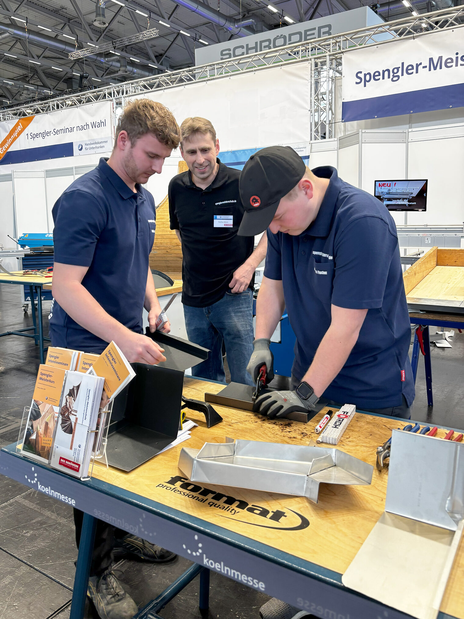 Am Stand 428 in Halle 8 präsentierten die Meisterschüler der Spenglermeisterschule die ganze Vielfalt des Spenglerhandwerks: von der Anfertigung eines Wandanschlussfalzes (Bündnerfalz) über Faltenkehlen und gerundete Maurerabdeckungen bis hin zu kunstvoll gestalteten Origamis und handgefertigten Spenglerosen. Die Live-Anfertigungen boten spannende Einblicke in das Spenglerhandwerk und zogen kontinuierlich Besucher an.